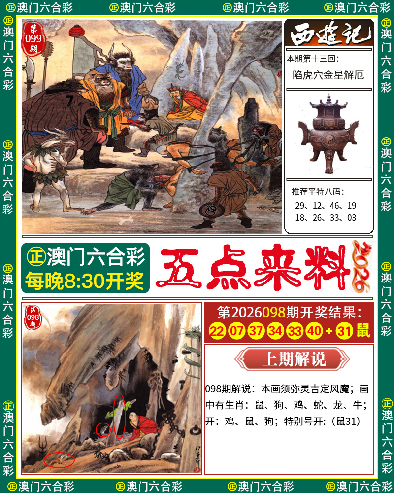 必中六肖:虎羊鸡鼠牛蛇 必中三肖:虎羊鸡 精选10码:41.29.36.48.10.22.31.43.18.14 必中六码:41.29.36.48.10.22 | |